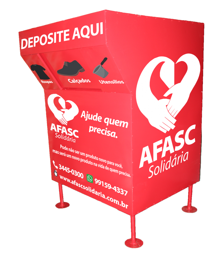 A Afasc Solidária conta com várias formas de recebimento de doações. Seja através da entrega dos materiais pessoalmente em nossa sede, recolhimento no endereço do doador ou em pontos estratégicos da cidade, basta escolher o local mais próximo para levar os produtos.